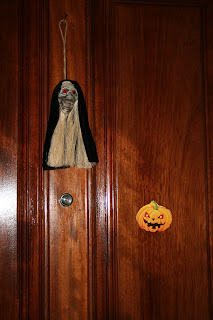 Á porta da minha casa é assim que celebramos o dia das bruxas. Se fosse há 8/9 anos atrás tinha expulso os meus pais de casa e tinha tudo preparado para receber os meus amigos. Ia até a uma loja no NorteShopping que tinha enfeites de Halloween e a minha casa transformava-se. Acho que aquilo era mais um pretexto para ter rapazes (só três!) e um montão de amigos a destruir-me a casa! Mas era engraçado, fazia convites e tudo! Mas o tempo passa e agora celebro o dia das Bruxas de uma forma muito mais comedida! Agora é só esperar pelas nove e meia da noite que é quando as criancinhas vão tocar à nossa campainha...MUAHAHA