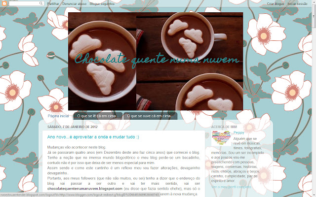 Portanto, aos meus followers (que não são muitos, eu sei) tenho a dizer que o endereço do blog vai passar a ser outro e vai ter mais sentido, vai ser chocolatequentenumanuvem.blogspot.com (eu disse que fazia sentido ehehe), mas só o vou alterar daqui a dois/três dias, para vocês terem tempo de se habituarem à nova mudança.