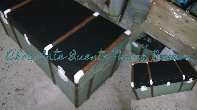 Ela estava em bom estado. Decidimos retirar o papel que estava a revestir por dentro e trocamos por plástico, uma vez que a arca vai ficar ao ar livre tínhamos que ter alguma coisa que protegesse o conteúdo. Por fora, na tampa, era metal e como decidimos não pintar, passamos um produto para proteger e tratar a madeira (e que fez logo com que ela ficasse mais escura, como dá para ver na imagem) e com uma fita cola das grandes (entre dez a quinze centímetros de largura) em preto colamos ao metal.